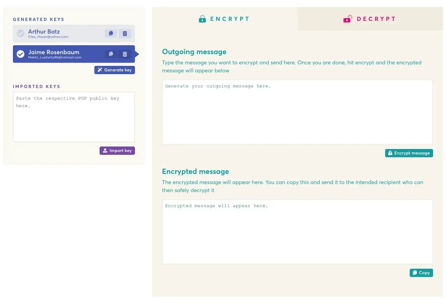 Encrypting messages using PGP is the industry standard. Everyone has a private and a public key. Your private key, well, needs to be kept private so only you can read messages. Your public key is distributed to anyone who wants to send you secret, encrypted messages. Managing keys, encrypting messages and decrypting messages should be a smooth experience. EncryptEasy is all about making it easy.