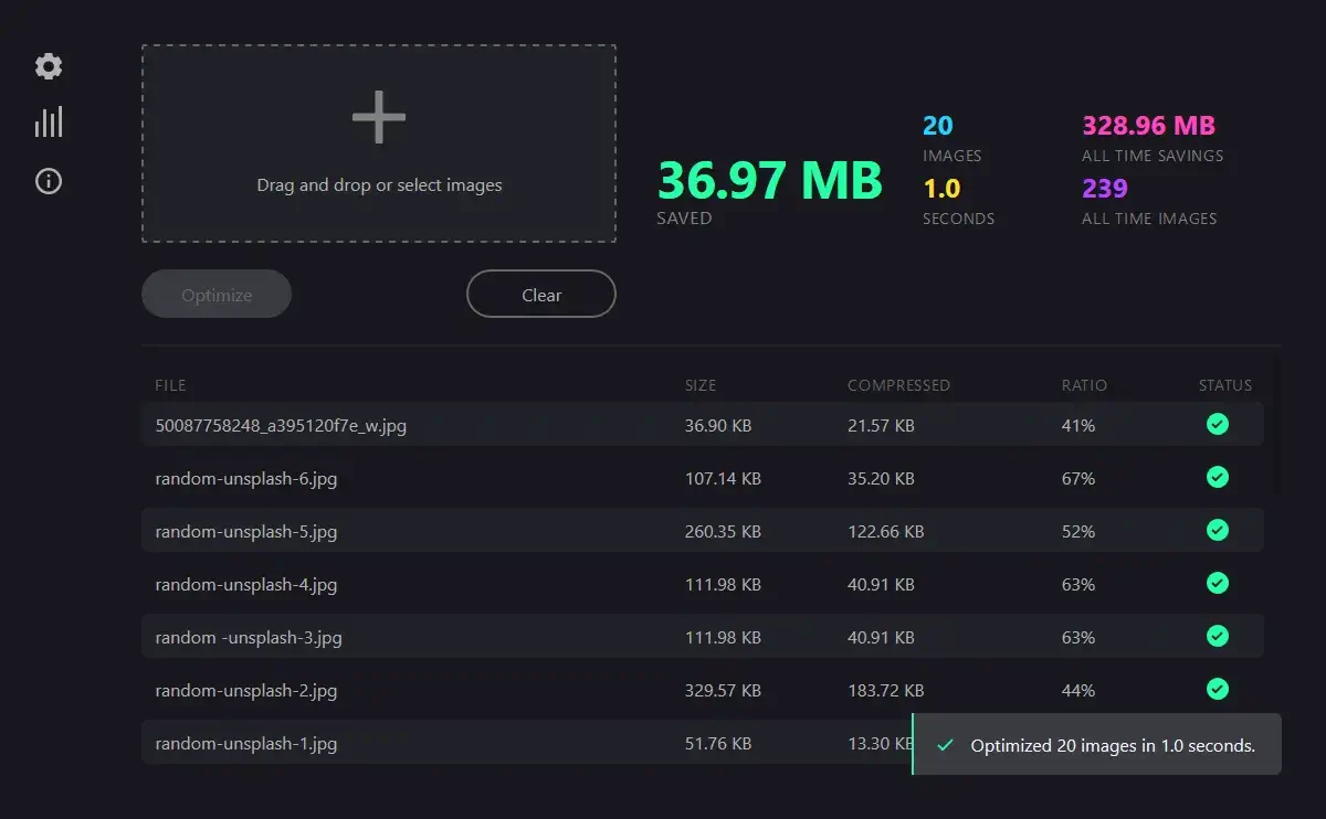 커뮤니티Showcase옵티머스(Optimus)버전: 다음 버전 🚧옵티머스(Optimus)Optimus 데스크탑 이미지 최적화 애플리케이션입니다. WebP, JPEG, PNG 이미지 포맷 형식간의 변환 및 압축을 지원합니다.