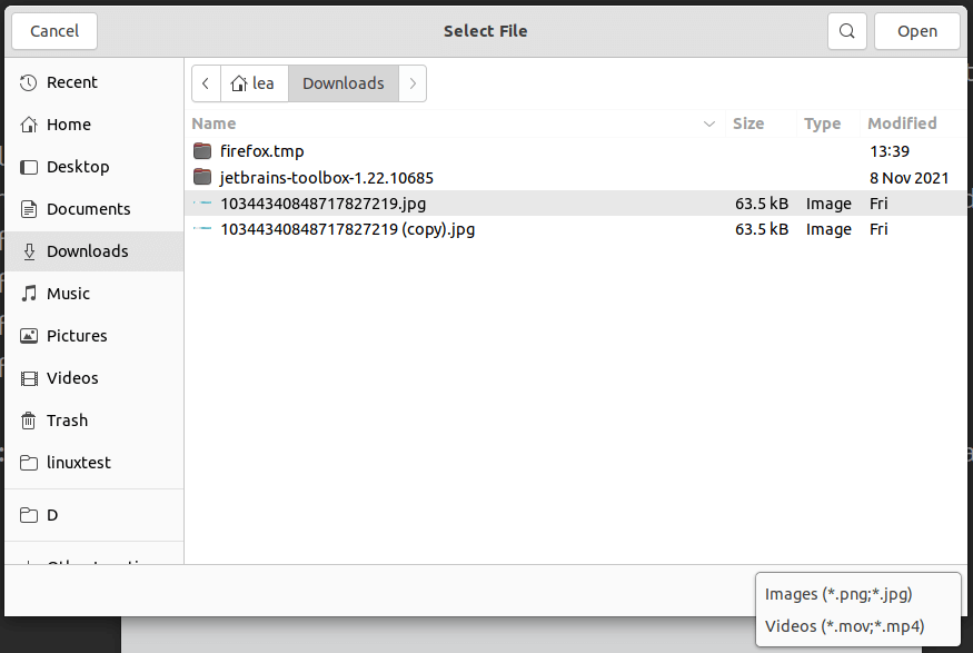 Isso resultará na caixa de diálogo Abrir Arquivo usando *.png,*.jpg,*.mov,*.mp4 como filtro.